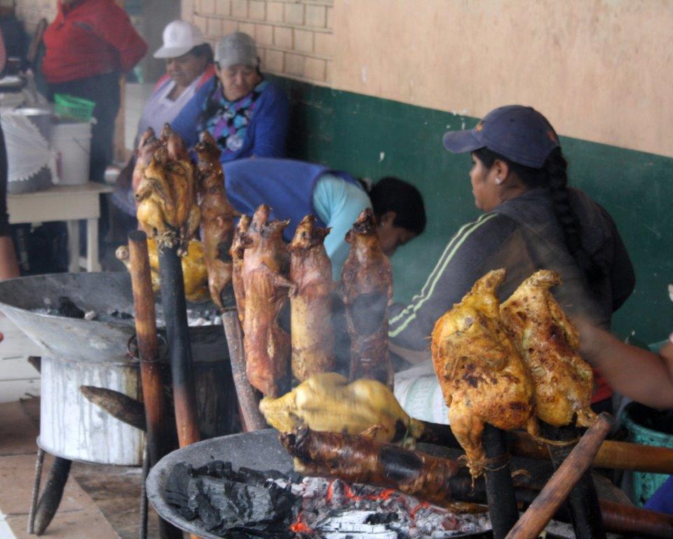 Gualaceo est une des plus vieilles villes coloniales d’Équateur, fondée en 1540, avant Cuenca ! C’est maintenant la capitale de la chaussure (ça vous en bouche un coin, hein !). Sa spécialité culinaire est le fameux «cuy», le Cochon d’Inde, qui n’est pas un cochon et qui ne vient pas d’Inde, mais de la cordillère des Andes. Une erreur des conquistadores qui croyaient être en Inde !